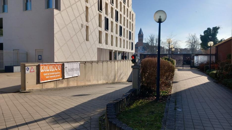 - Neem de inrit naar de ondergrondse parking, links van het OCMW-gebouw. Je mag het rode licht negeren.