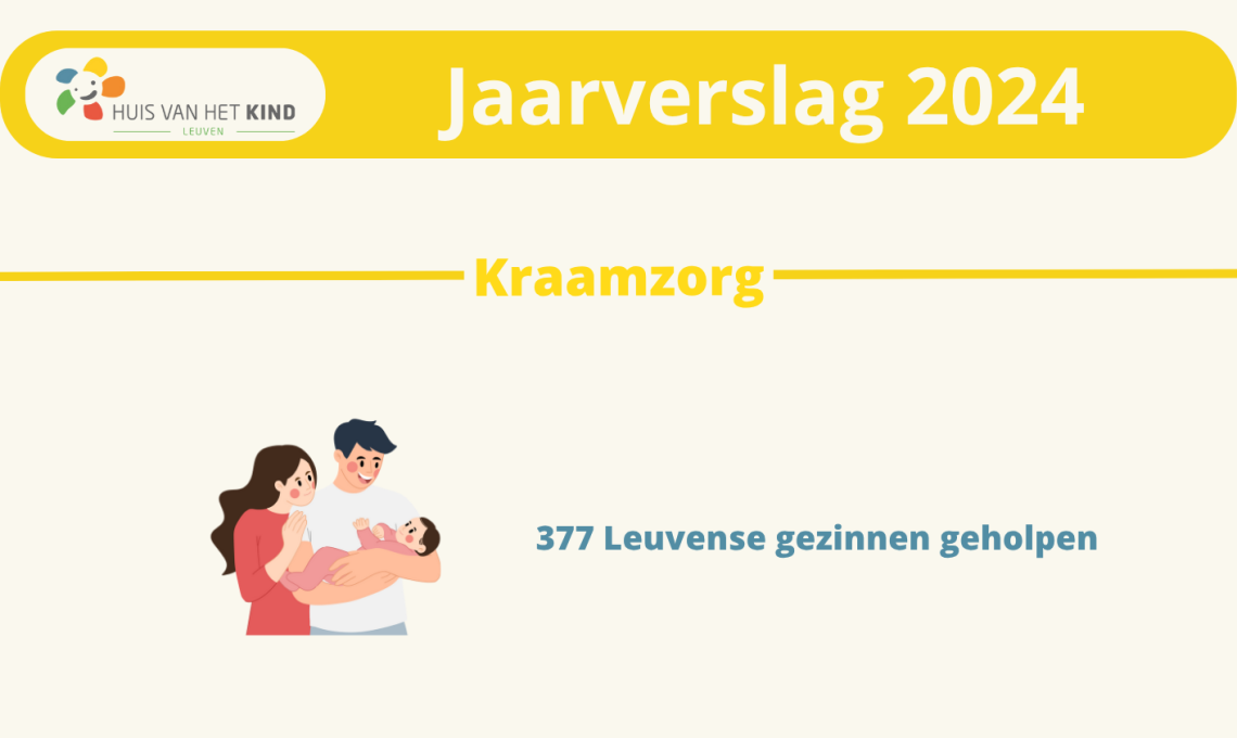 Kraamzorg draagt bij aan de basisondersteuning voor gezinnen gedurende de kraamperiode. Ook in ons Huis van het Kind kunnen we terugvallen op de betrokkenheid van diverse actoren kraamzorg en gezinszorg. Zij bereikten in 2024 in totaal 377gezinnen (in 2023 450) en presteerden in die gezinnen heel wat kraamzorguren.